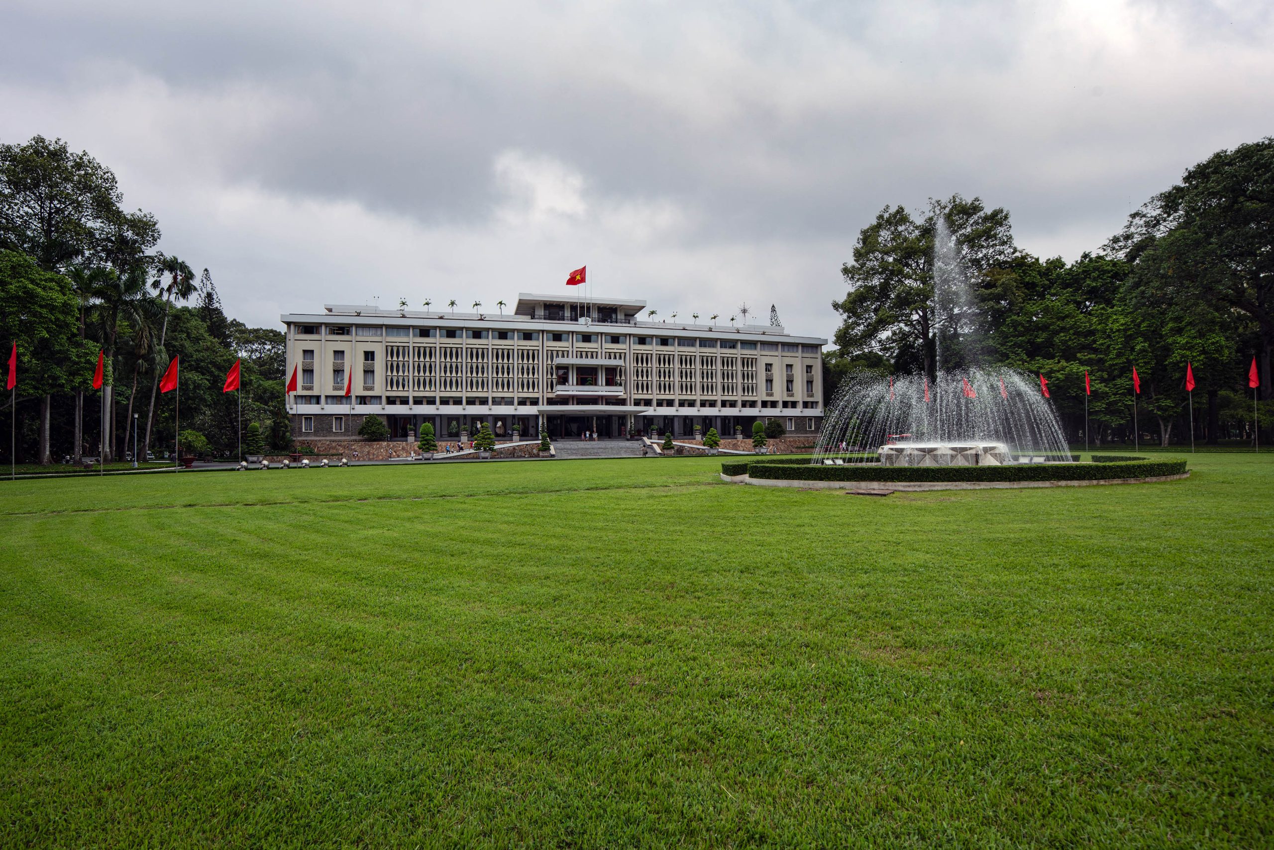 Originally built between 1962 and 1966 by architect Ngô Viết Thụ, the palace replaced the former Norodom Palace, which was damaged in a 1962 bombing. The five-story structure spans 120,000 square meters and sits amid 12 hectares of meticulously maintained gardens featuring tropical plants, walkways, and lawns.
