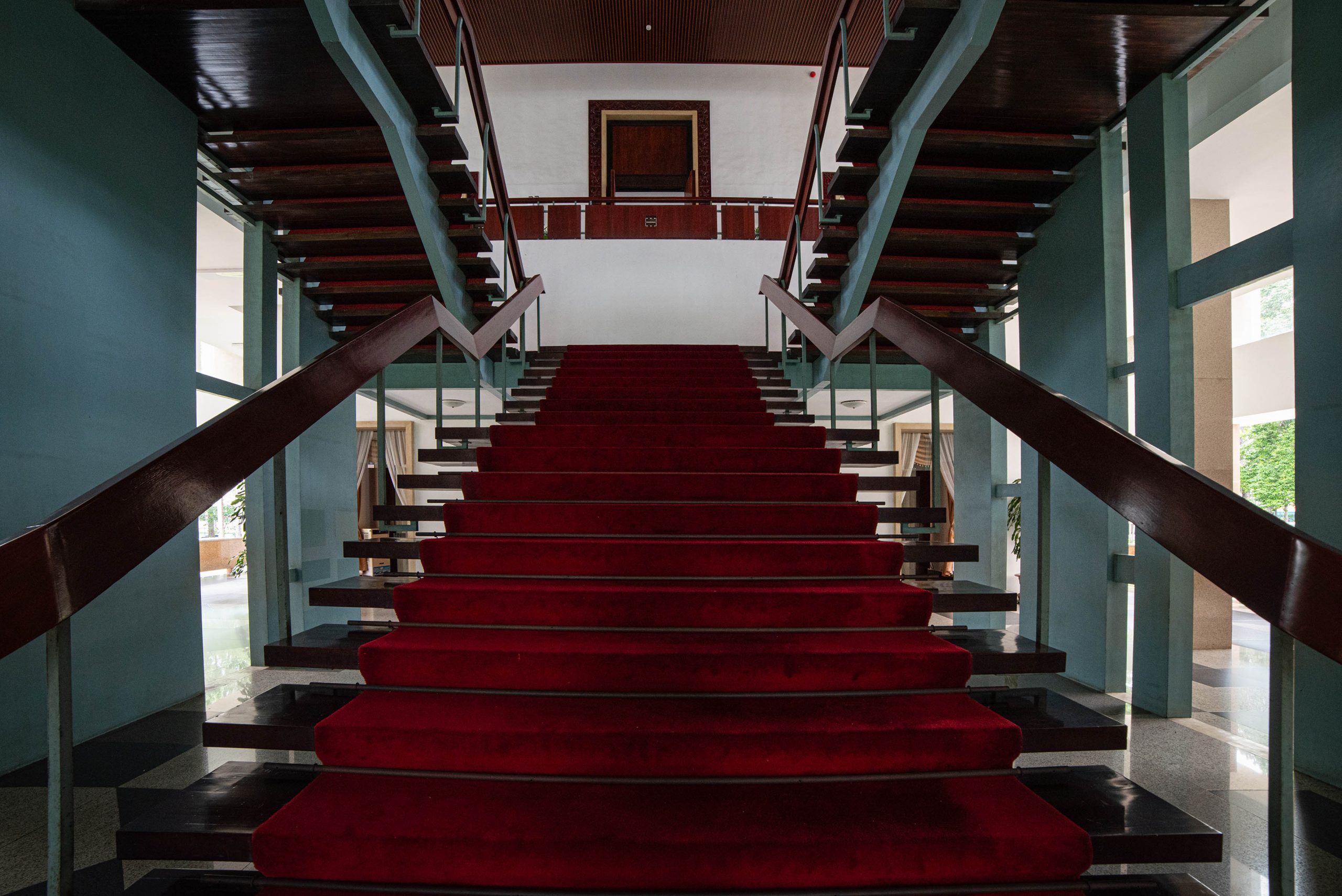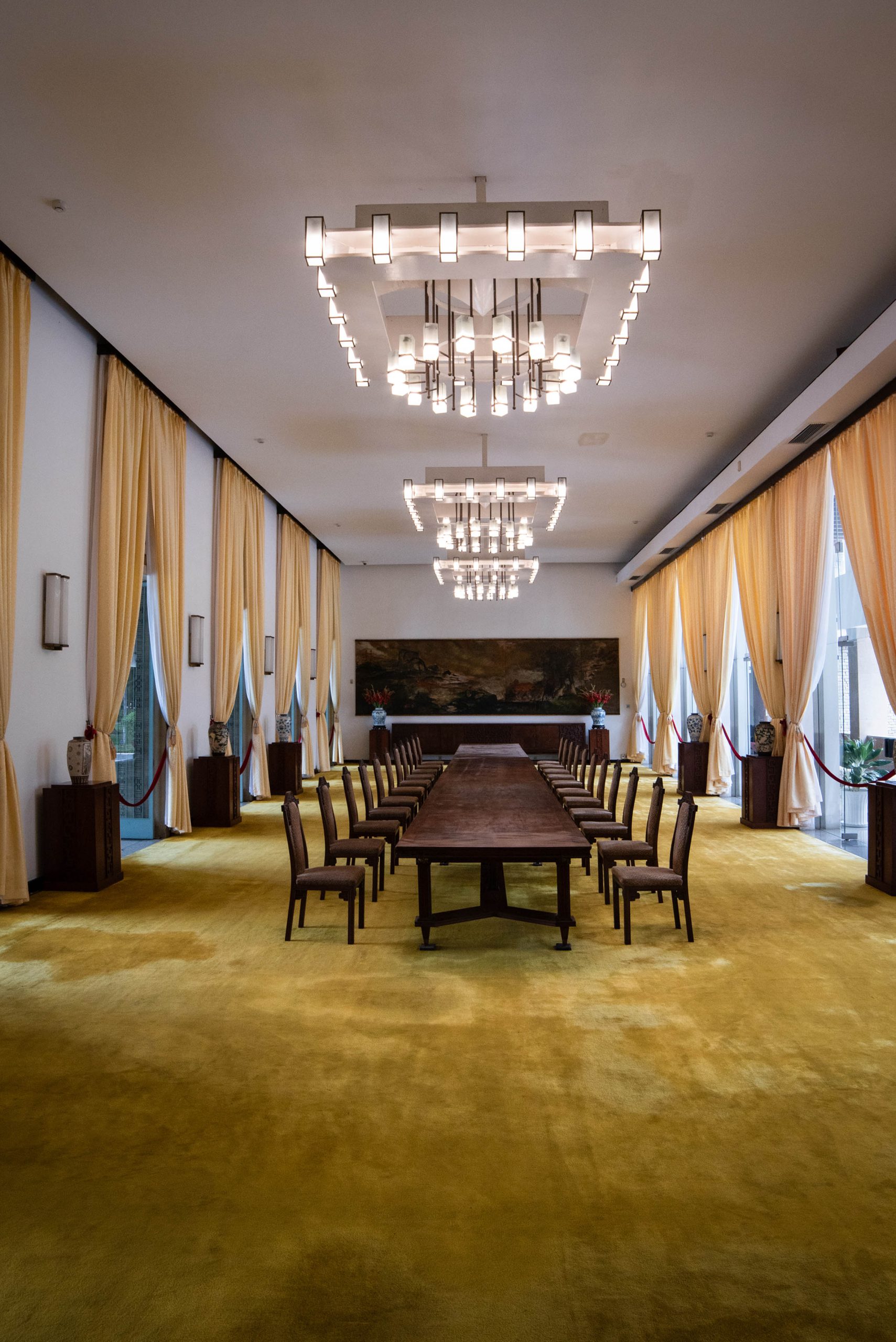 Inside, the palace remains largely unchanged since 1975, offering visitors a glimpse into 1960s Vietnamese architecture and design. The first floor houses meeting rooms, including the formal reception hall with its red carpet and elaborate crystal chandeliers. These rooms feature detailed lacquer paintings by prominent Vietnamese artists and host various ceremonial functions.